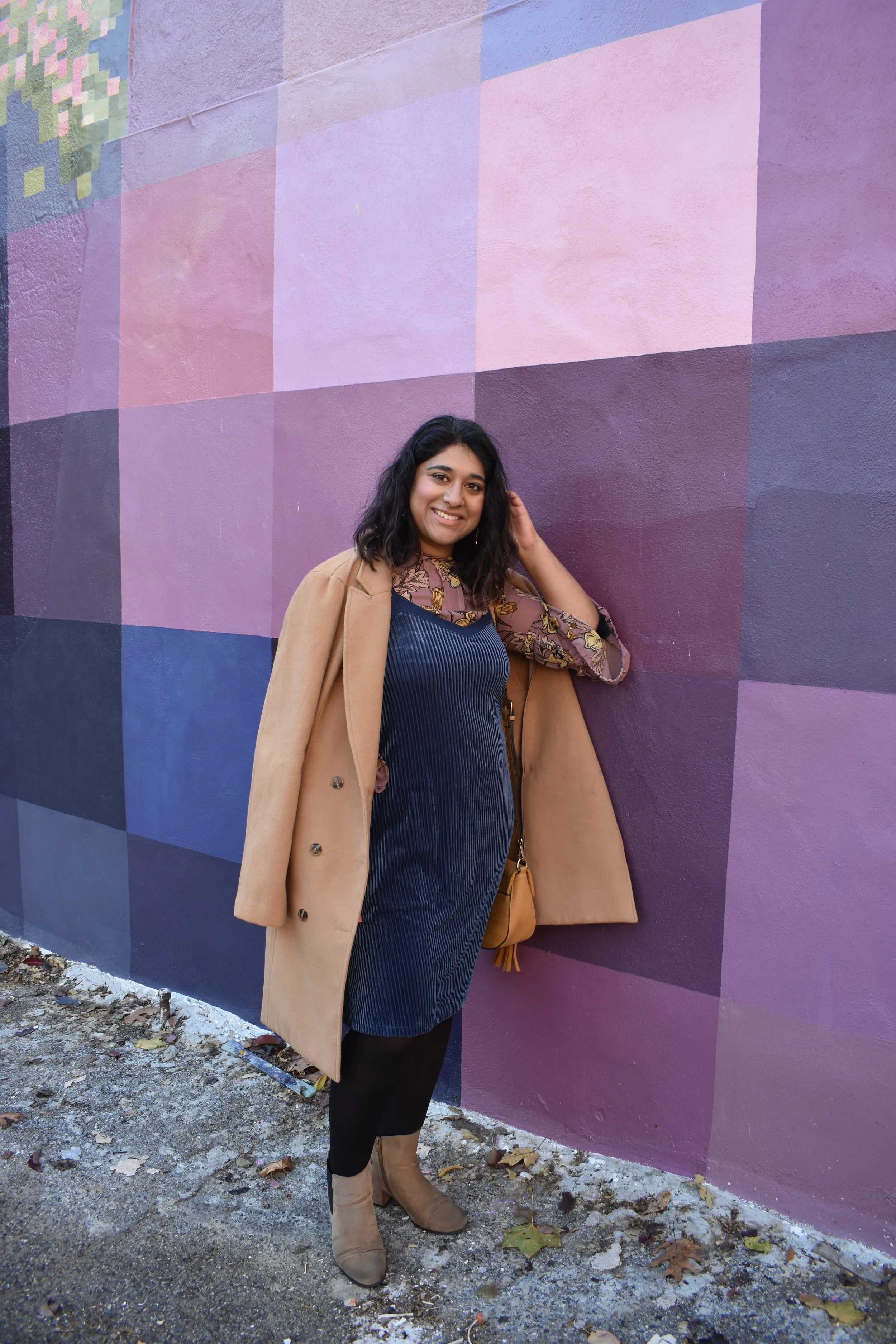 Now we get to the fun part. Let's. Talk. Clothes. An #ootd post isn't complete without a banging outfit. It's no secret that I'm not a huge fan of minimalism - but even if you sway that way, I would encourage you to find layers that will grab the eye. Here's the formula I typically use when styling bloggers and models. Contrast plus texture divided by an outer layer equals dimension. Take Priyanka from Paint The Town Chic. She's contrasting a dark textured dress with a purple printed shirt. And this look wouldn't be complete without the ever so chic (and perfectly draped) camel coat. Plan to have pieces that look good together and can work as stand alones so you get more look for your buck.